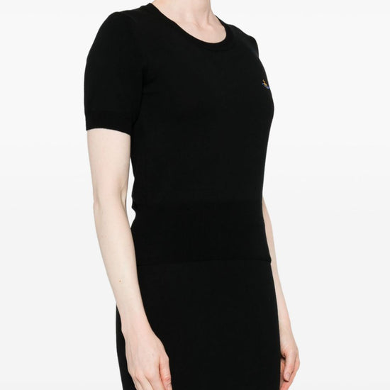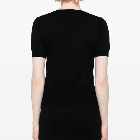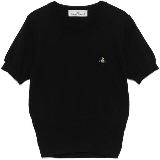 Black cotton-cashmere blend knitted construction signature orb logo embroidery crew neck short sleeves ribbed cuffs and hem we've partnered with good on you — an independent agency that rates how brands perform in relation to their impact on the planet, people and animals, with a multi-criteria rating simplified to a five points scale. in order to be awarded our conscious label, larger brands need to score a minimum of four out of five ('good'), while smaller brands must score at least three out of five ('it's a start').  this item comes from a brand rated three out of five ('it's a start') by good on you at the time it was added on farfetch. please note, this is a brand-level rating and does not guarantee that this product is made with conscious materials. learn more about what makes a product conscious on our conscious criteria page.  cotton and cashmere blend top size and fit - this piece fits true to size. we recommend you get your regular size. model is 1,75m / 5ft 8in wearing size s