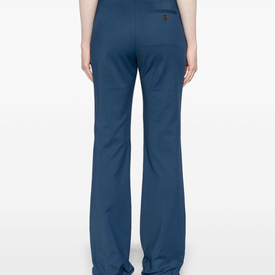 Navy blue stretch-design tailored design belt loops pleat detailing high-waisted concealed front button, hook and zip fastening slight flare two side slit pockets rear button-fastening jetted pocket we've partnered with good on you — an independent agency that rates how brands perform in relation to their impact on the planet, people and animals, with a multi-criteria rating simplified to a five points scale. in order to be awarded our conscious label, larger brands need to score a minimum of four out of five ('good'), while smaller brands must score at least three out of five ('it's a start'). this item comes from a brand rated three out of five ('it's a start') by good on you at the time it was added on farfetch. please note, this is a brand-level rating and does not guarantee that this product is made with conscious materials. learn more about what makes a product conscious on our conscious criteria page high-waisted flared trousers size and fit - this piece fits true to size. we recommend you get your regular size. model is 1,75m / 5ft 8in wearing size 40 (it)