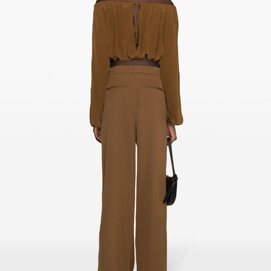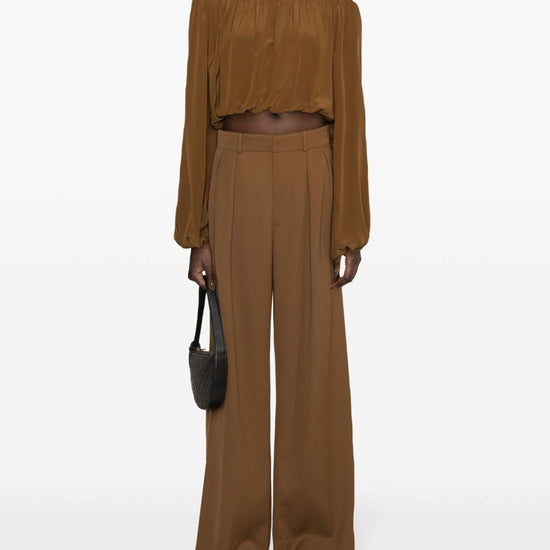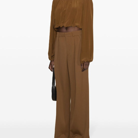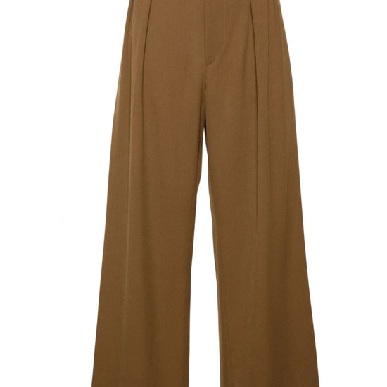 Brown virgin wool twill weave high-rise hook and zip fly fastening belt loops two side slash pockets two rear jetted pockets pleat detailing to the waist wide leg low-rise wool trousers size and fit - this piece fits true to size. we recommend you get your regular size. model is 1,75m / 5ft 8in wearing size s