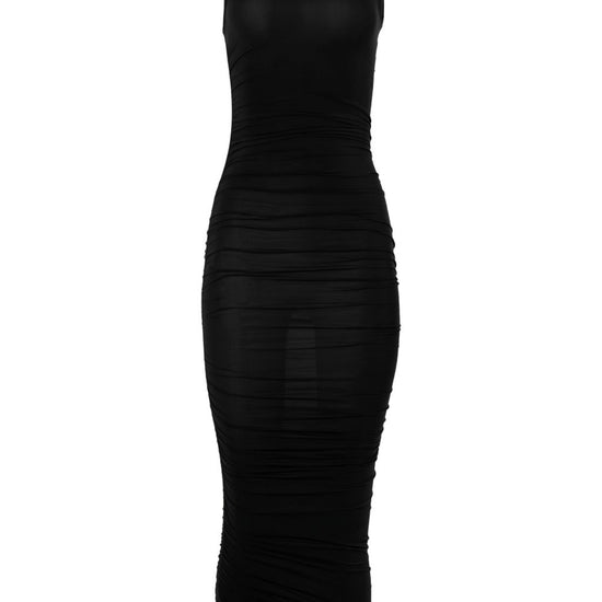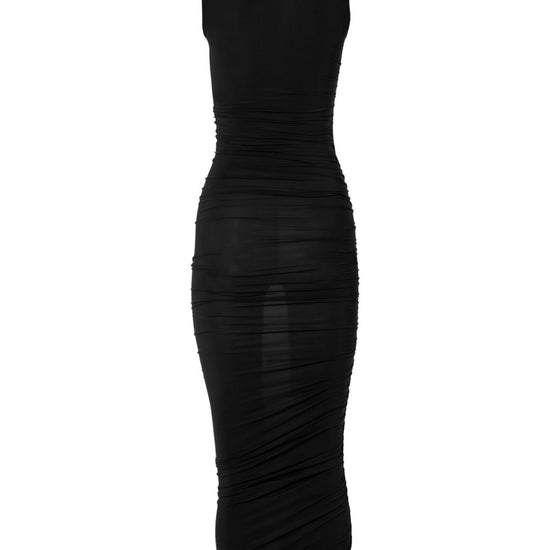 Black sheer finish draped detailing sleeveless round neck fitted design sheer drape dress