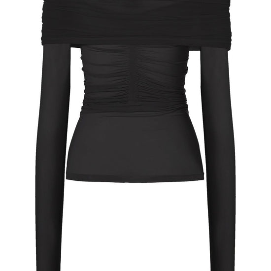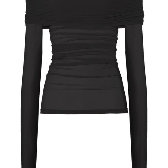 Black long sleeves sheer finish drape detail off-shoulder thumb slit detail off-shoulder top