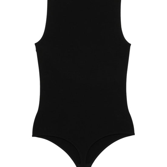 Black modal blend lightweight jersey concealed press-stud fastening high neck sleeveless high cut just a reminder that this piece must be tried on over your own garments. hgih-neck bodysuit