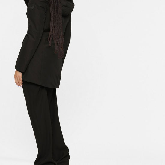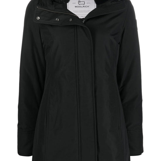 Black logo patch at the sleeve classic hood front button and zip fastening long sleeves slip pockets to the sides straight hem thigh-length boulder faux fur parka