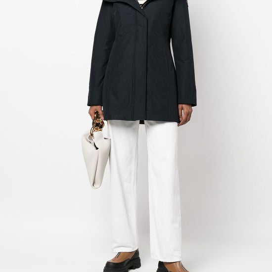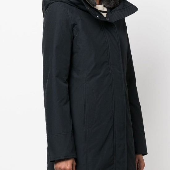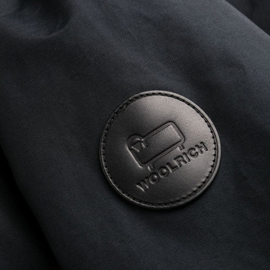 Logo-patch zip-up hoodie from woolrich featuring navy blue, cotton blend, padded design, down-feather filling, classic hood, front zip fastening and long sleeves. boulder parka coat size and fit - this piece fits true to size. we recommend you get your regular size. model is 1,75m / 5ft 8in wearing size s