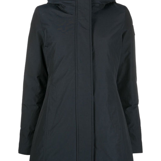 Logo-patch zip-up hoodie from woolrich featuring navy blue, cotton blend, padded design, down-feather filling, classic hood, front zip fastening and long sleeves. boulder faux fur parka