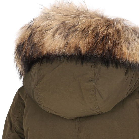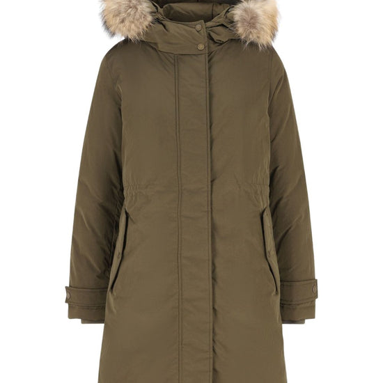 Olive green duck down filling detachable fur hood concealed zip button closure flap pockets ribbed cuffs grace long parka