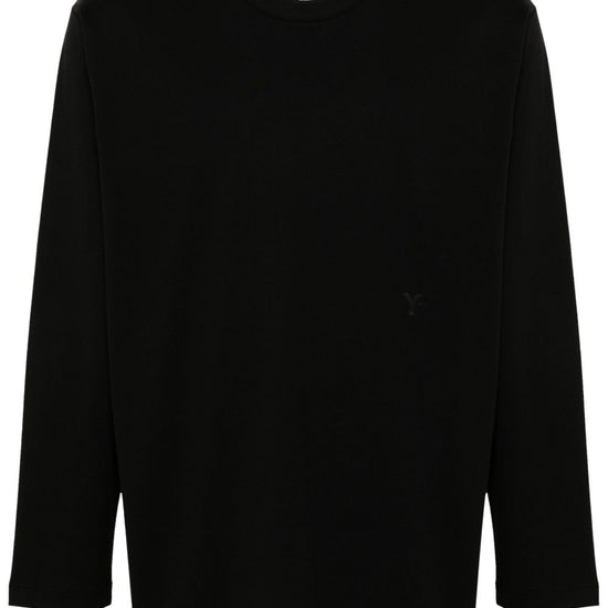 Black cotton jersey texture round neck long sleeves tonal logo print to the front short side slits straight hem logo cotton t-shirt size and fit - chest: 126.0 centimetres. sleeve length: 62.0 centimetres. length: 78.0 centimetres. shoulder width: 53.0 centimetres.