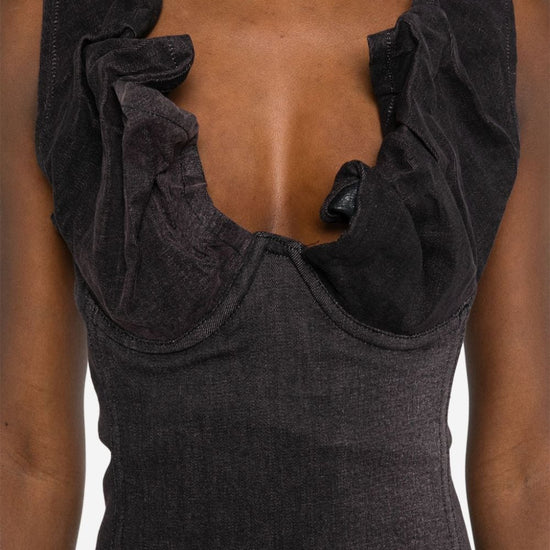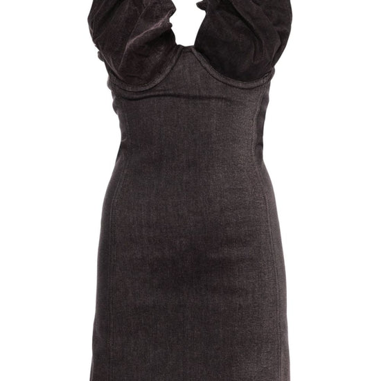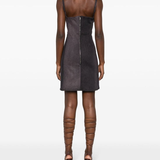 Purple black cotton blend denim oversize sweetheart neck adjustable shoulder strap boned bodice straight hem concealed rear hook and zip fastening denim mini dress size and fit - this piece fits true to size. we recommend you get your regular size. model is 1,75m / 5ft 8in wearing size 36 (fr)