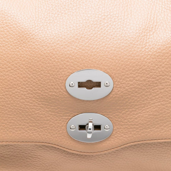 Light brown twist-lock fastening single top handle adjustable detachable shoulder strap metal feet postina daily medium leather handbag size and fit - depth 17 cm, height 22 cm, width 35 cm, handle 20 cm, shoulder strap 100 cm