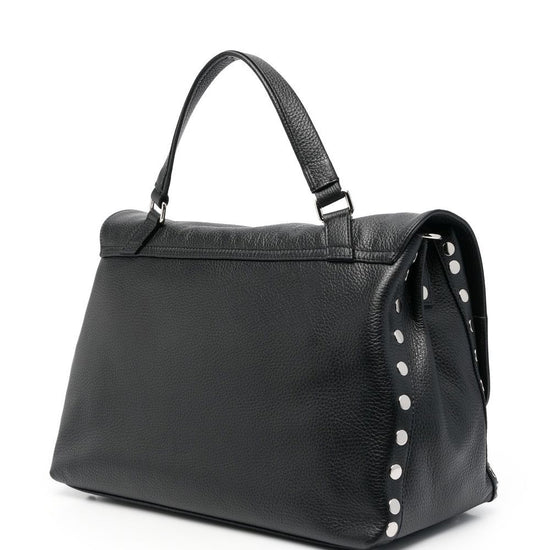 Black calf leather silver-tone clasp fastening silver-tone hardware silver-tone stud detailing foldover top with press-stud fastening single circular top handle postina daily medium leather handbag size and fit - depth: 18.0 centimetres. handle: 15.0 centimetres. height: 25.0 centimetres. strap: 70.0 centimetres. width: 37.0 centimetres.