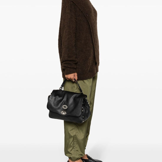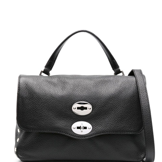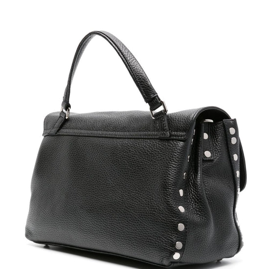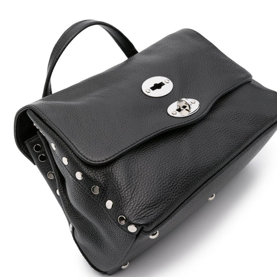 Black calf leather grained texture silver-tone stud detailing tonal stitching foldover top twist-lock closure single flat top handle adjustable detachable shoulder strap full lining internal logo patch internal zip-fastening pocket internal slip pocket partitioned compartment metal feet silver-tone hardware this piece comes complete with a protective dust bag. postina daily small leather handbag