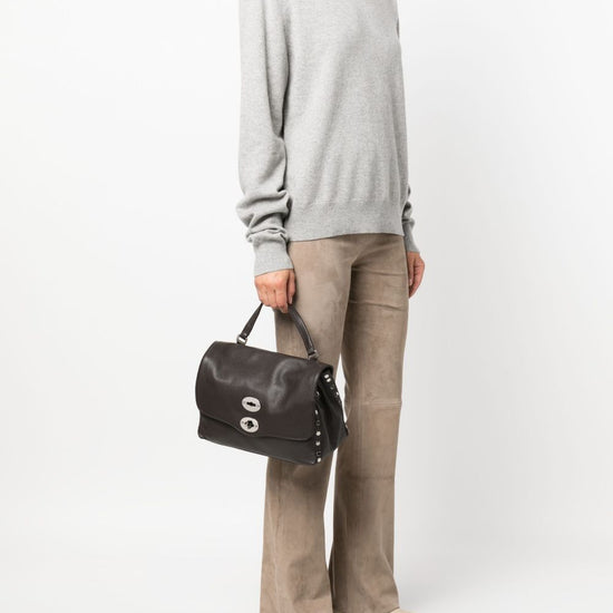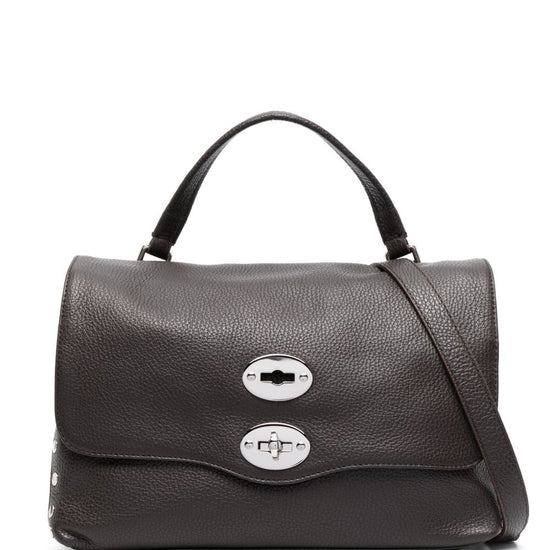 Black calf leather grained texture foldover top with turn-clasp fastening single flat top handle adjustable detachable shoulder strap silver-tone stud detailing metal feet partitioned compartment internal zip-fastening pocket internal slip pocket internal card slot debossed internal logo full lining this piece comes complete with a protective dust bag. postina daily small leather handbag size and fit - depth: 14.0 centimetres. handle: 11.0 centimetres. height: 20.0 centimetres. width: 30.0 centimetres. strap: 50.0 centimetres.