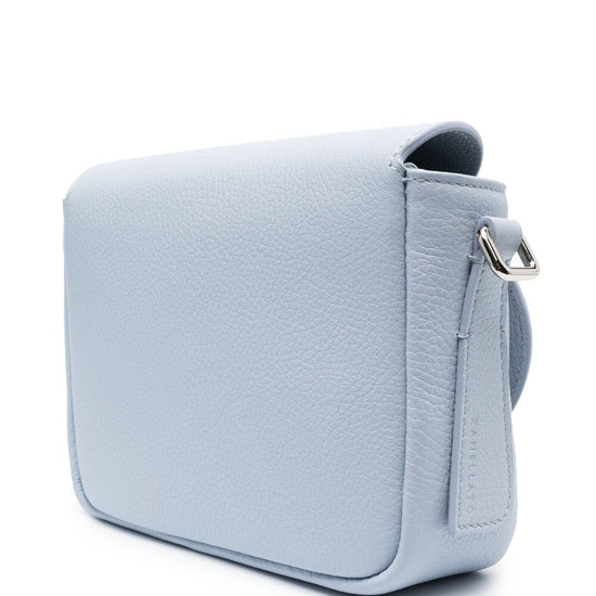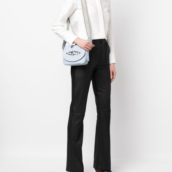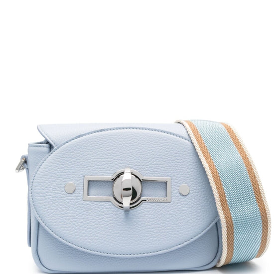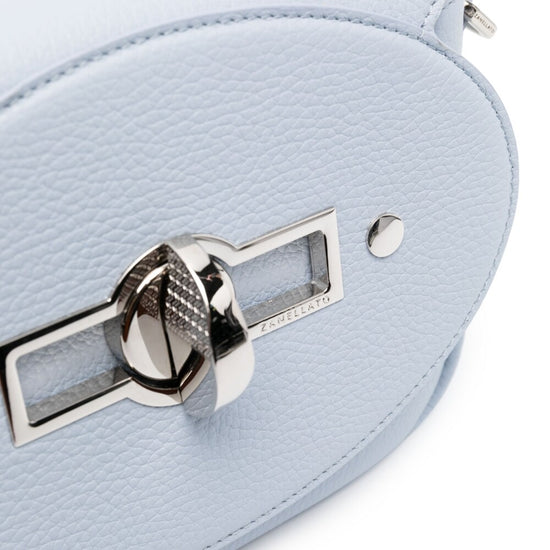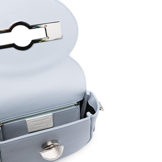 Small tina daily leather shoulder bag from zanellato featuring light blue, calf leather, grained texture, silver-tone hardware, internal logo patch, foldover top, twist-lock fastening, adjustable detachable shoulder strap, main compartment and internal zip-fastening pocket. small tina daily leather crossbody bag size and fit - width 7,87 in / 20 cm