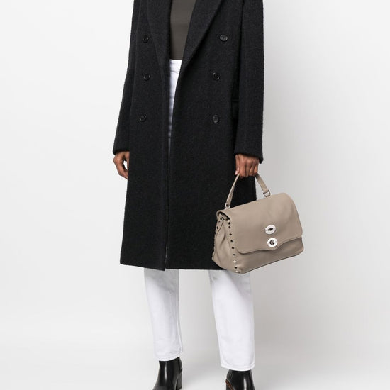 Taupe brown leather pebbled texture silver-tone hardware silver-tone stud detailing single flat top handle detachable shoulder strap foldover top main compartment internal zip-fastening pocket postina daily small leather handbag size and fit - width 22 cm height 12 cm depth 1 cm shoulder strap 120 cm.