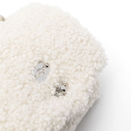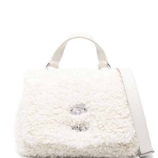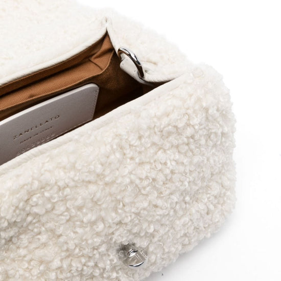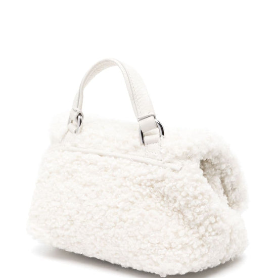 White shearling rectangle body single flat top handle adjustable detachable shoulder strap leather trim metal feet main compartment internal logo patch internal patch pocket contrast lining silver-tone hardware foldover top turn-clasp fastening this piece comes complete with a protective dust bag. postina baby teddy handbag size and fit - depth 12 cm. handle 8 cm. height 14 cm. strap 124 cm. width 20 cm.