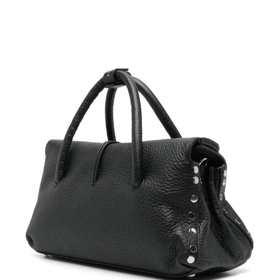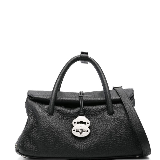 Black calf leather pebbled texture rectangle body foldover top with magnetic fastening turn-clasp fastening two rolled top handles adjustable detachable shoulder strap silver-tone stud detailing with engraved logo metal feet partitioned compartment internal logo stamp internal zip-fastening pocket internal patch pocket contrast lining this piece comes complete with a protective dust bag. dotta centauro small leather handbag