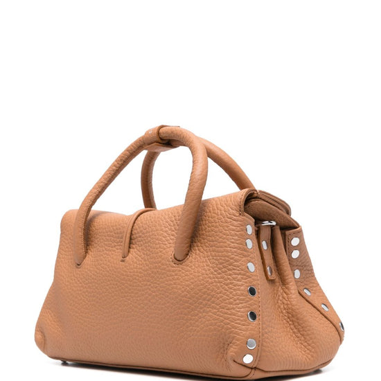 Cognac brown calf leather pebbled texture stud embellishment foldover top two rolled top handles adjustable detachable shoulder strap partitioned compartment internal zip-fastening pocket contrast lining metal feet logo-engraved silver-tone hardware twist-lock fastening this piece comes complete with a protective dust bag. dotta centauro small leather handbag