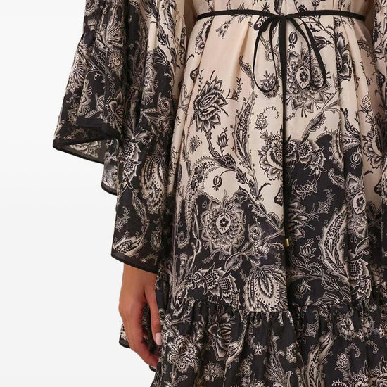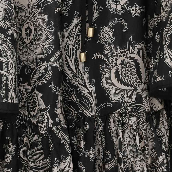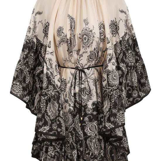 Cream paisley pattern drawstring waist wide bell sleeves layered ruffle hem rhiannon printed silk mini dress size and fit - this piece fits true to size. we recommend you get your regular size. model is 1,75m / 5ft 8in wearing size 1 (num)