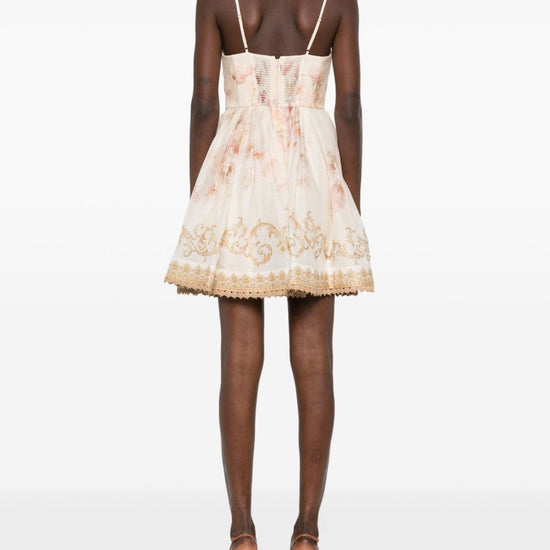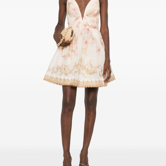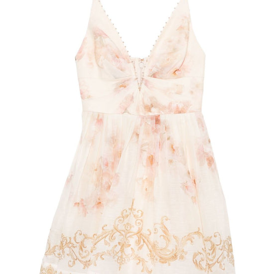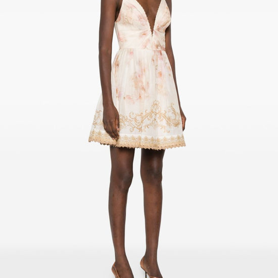 Cream floral print adjustable straps v-neck raffia trim hypnotic linen and silk mini dress
