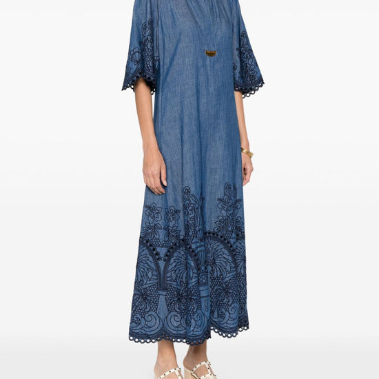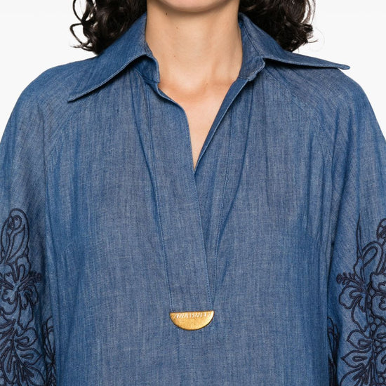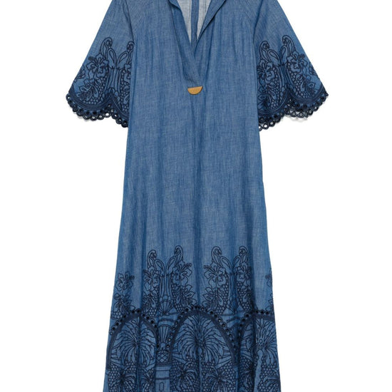 Indigo blue gold-tone logo plaque embroidered motif half-length sleeves coco embroidered denim dress size and fit - this piece fits true to size. we recommend you get your regular size. model is 1,75m / 5ft 8in wearing size 1 (num)