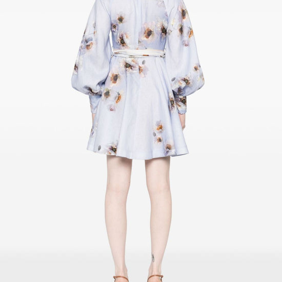 Lilac linen floral print button front long sleeves belted waist hypnotic linen shirtdress