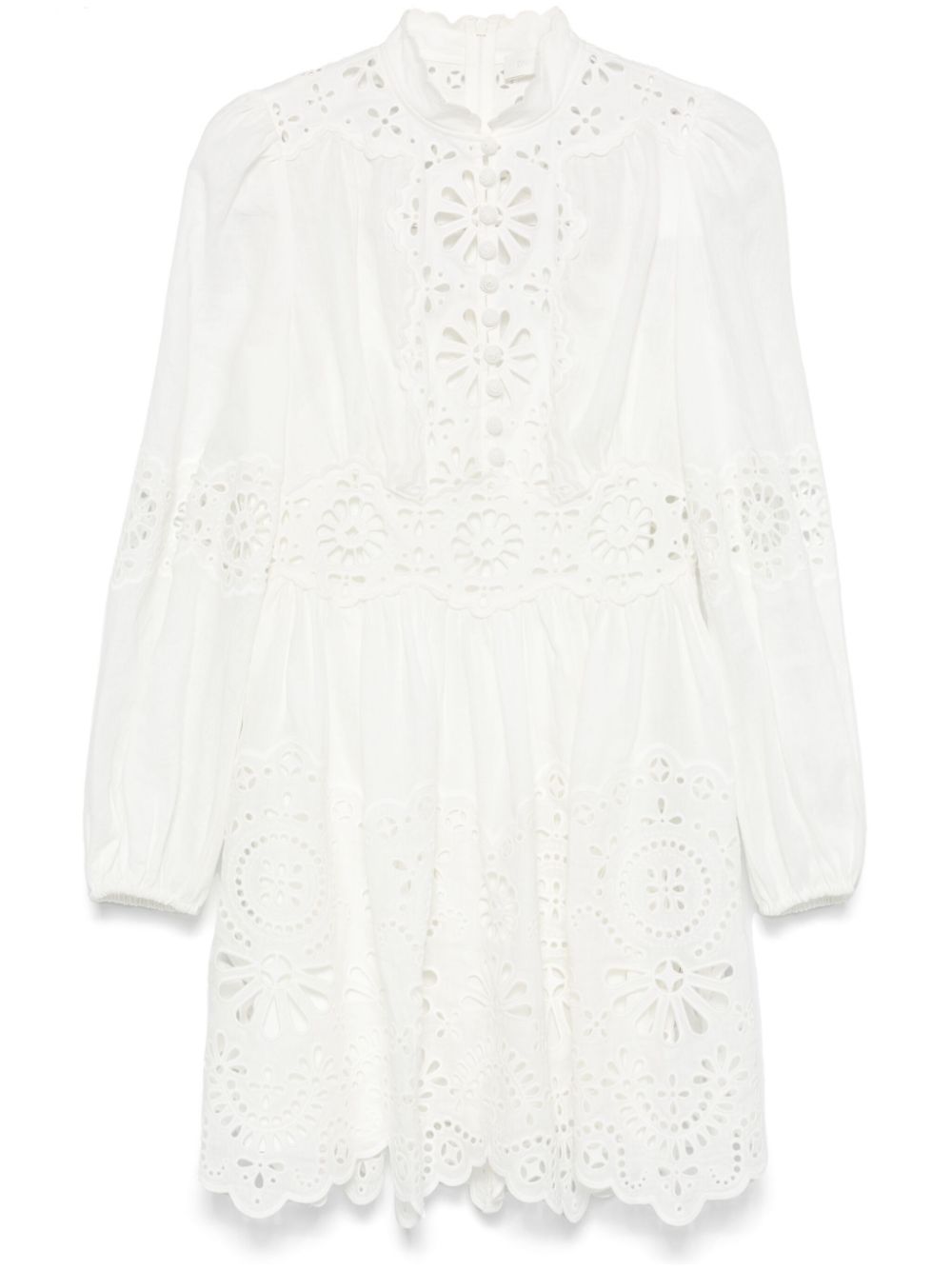 White, embellishment with english stitch, rear hidden zip closure, front button closure, scalloped hem, mock neck, long puff sleeves, elasticated hems, removable slip, flared fit, scalloped hem and above the knee length. acacia broderie linen mini dress size and fit - this piece fits true to size. we recommend you get your regular size. model is 1,75m / 5ft 8in wearing size 1 (num)