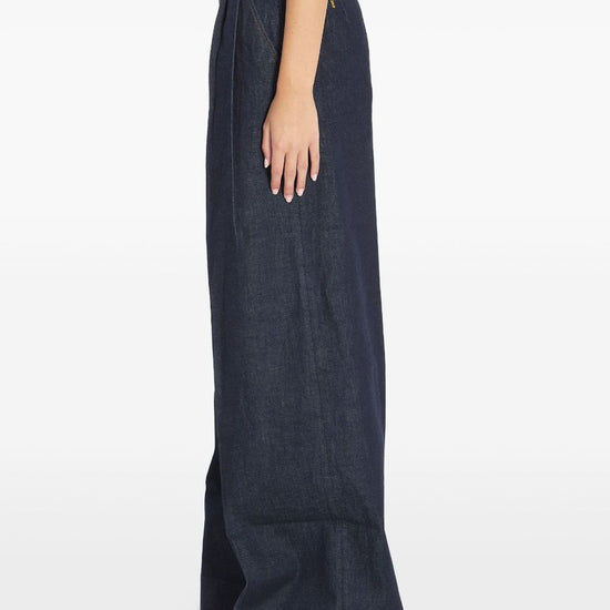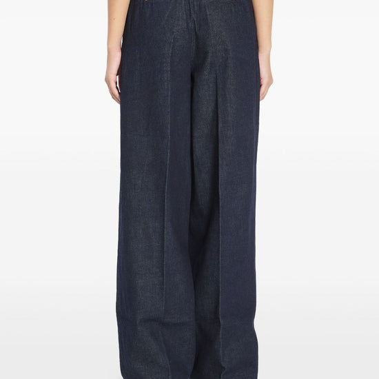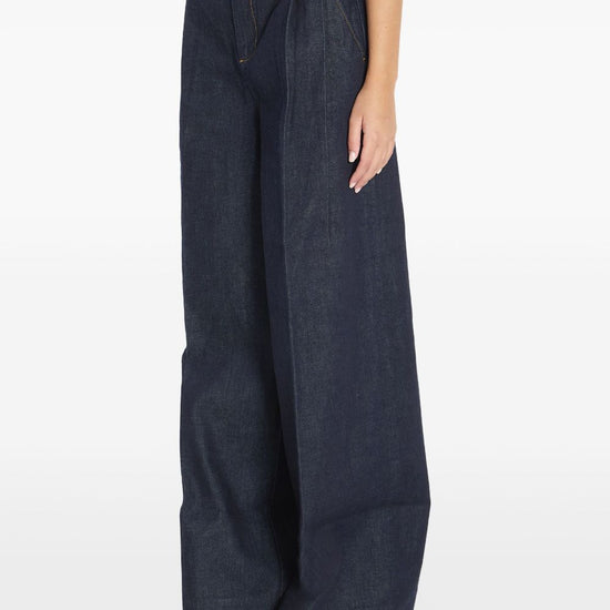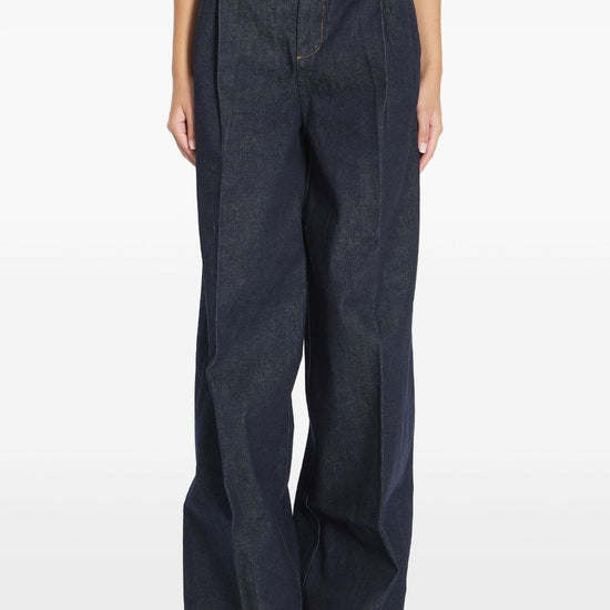 Night-sky blue pleated design wide waistband gold-button closure front-zip fastening slant pockets welt pockets wide-leg denim jeans