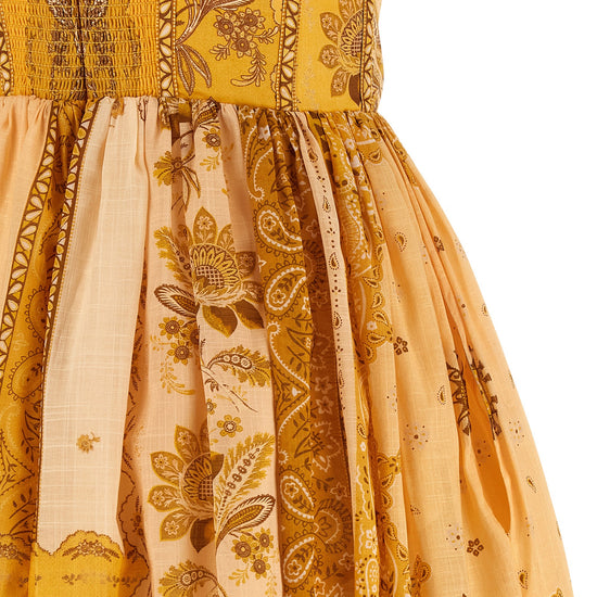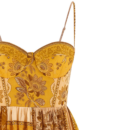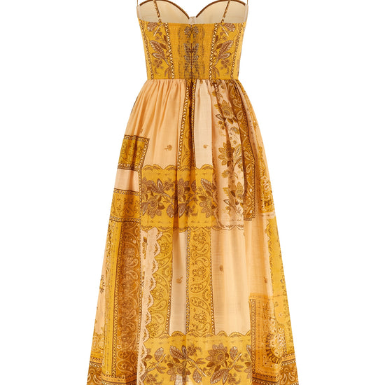 'lucky corset' midi dress in cotton bandana with curled waistband, thin straps, bodice with padded cups and cues, elastic back and concealed zip closure. size and fit - true to size fit