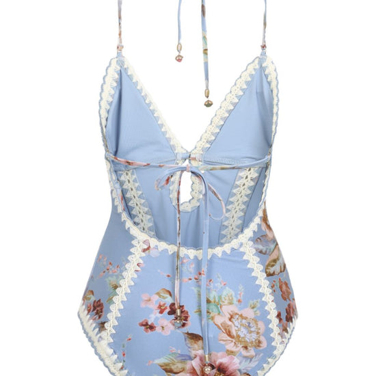 Blue floral print crochet trim tie fastening cut-out detail be mindful to try on swimwear over your own garments. awaken swimsuit