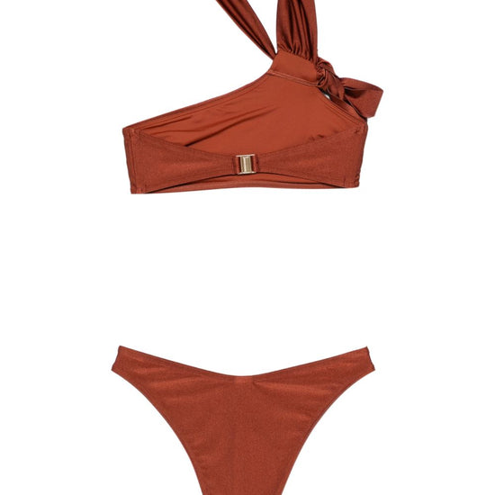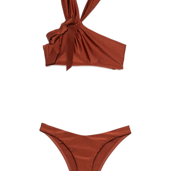 Brown tie detail one-shoulder design bikini bottoms be mindful to try on swimwear over your own garments. awaken bikini set