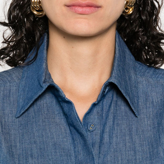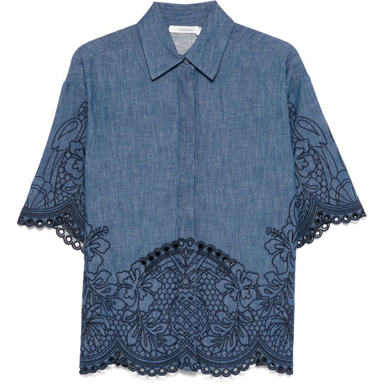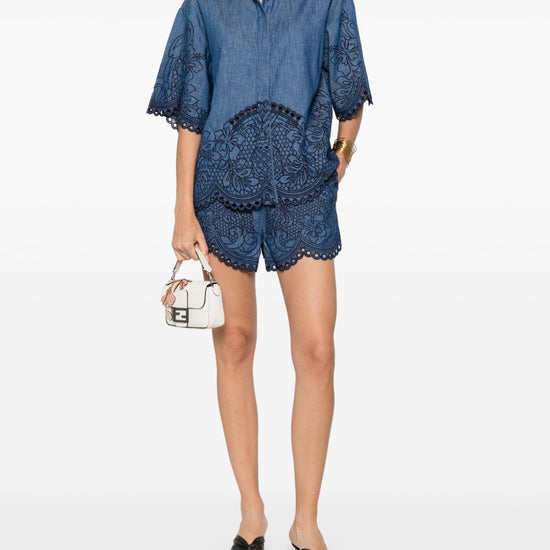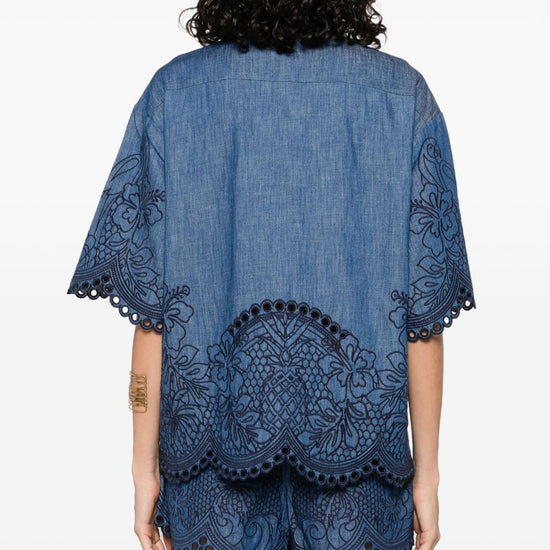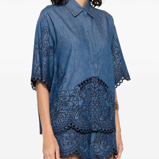 Blue concealed front button fastening short sleeves perforated detailing scallop edge coco embroidered denim shirt size and fit - this piece fits true to size. we recommend you get your regular size. model is 1,75m / 5ft 8in wearing size 1 (num)