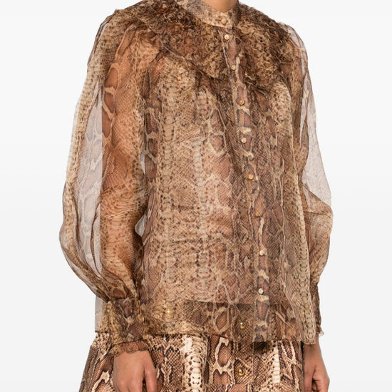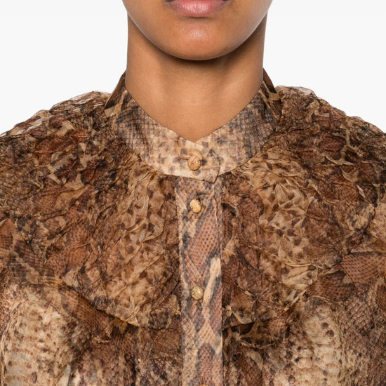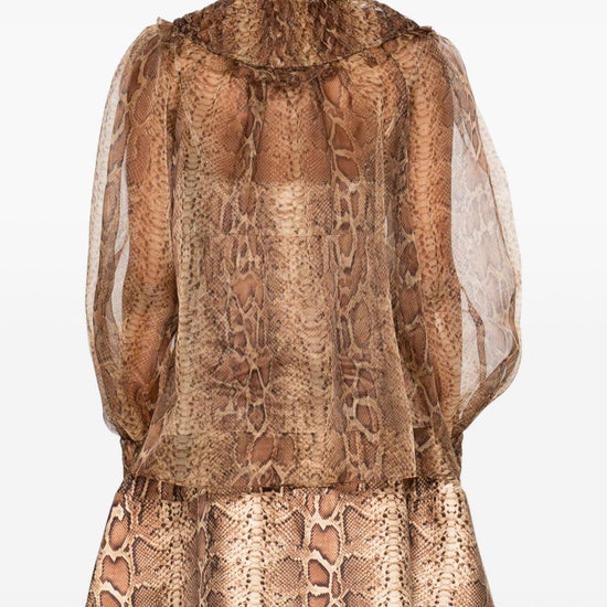 Brown snake print ruffled collar button fastening long sleeves ruffled cuffs silk printed silk shirt