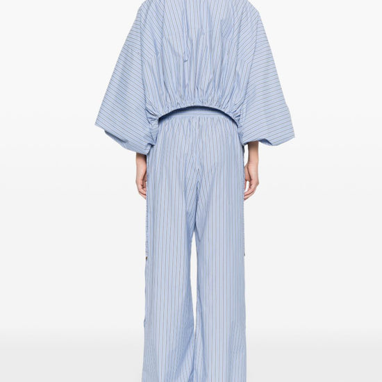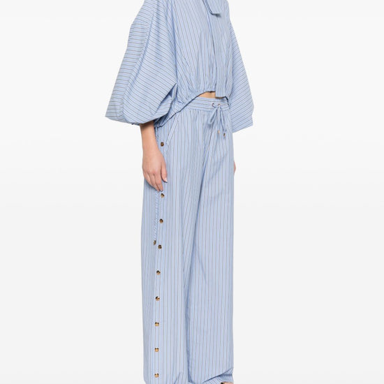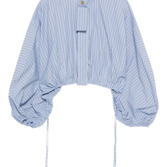 Blue striped mandarin collar gold-tone button drawstring fastening long sleeves denim cotton blouse