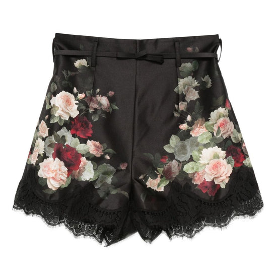 Black floral print lace trim bow detail belt loops printed silk and cotton shorts